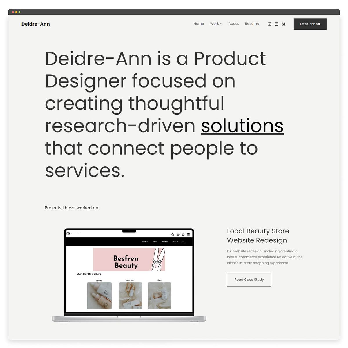 The homepage is characterized by bold typography and ample whitespace. The brief bio instantly tells visitors what the portfolio is all about and who it represents. The website has a clean and intuitive layout, making it easy to navigate. The website design reflects the designer’s philosophy and skills, focusing on aesthetics and functionality.