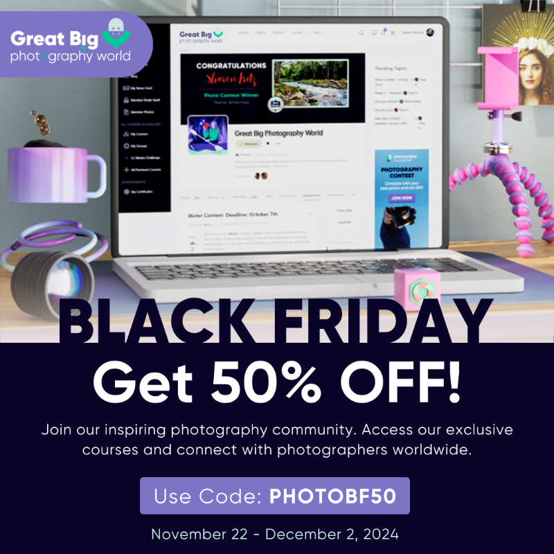 Great Big Photography World is an online community for photographers that offers premium courses, prime classes, and engaging challenges. Members gain exclusive access to a global network of passionate photographers, which provides networking and learning opportunities.
