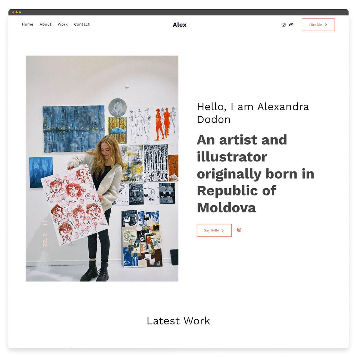 Alexandra Dodon is an artist and illustrator currently based in the Netherlands. The hero section on the homepage has bold typography that immediately captures attention. It provides a quick bio with a CTA button.