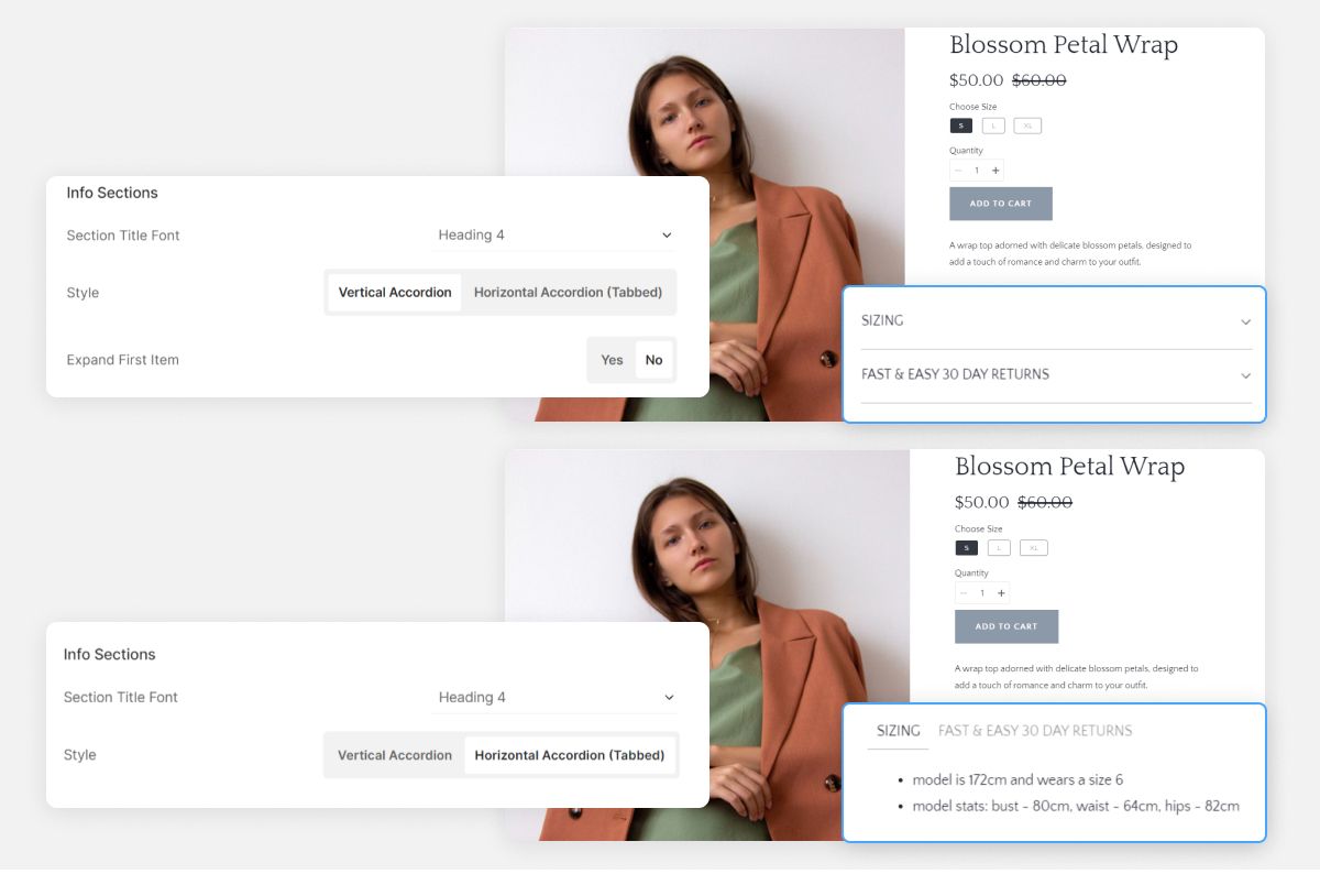Customers crave clarity before hitting that buy button. Info sections address this by showcasing additional content alongside the product description. Think product specs, shipping policies, warranty, FAQs, care instructions, and size charts.